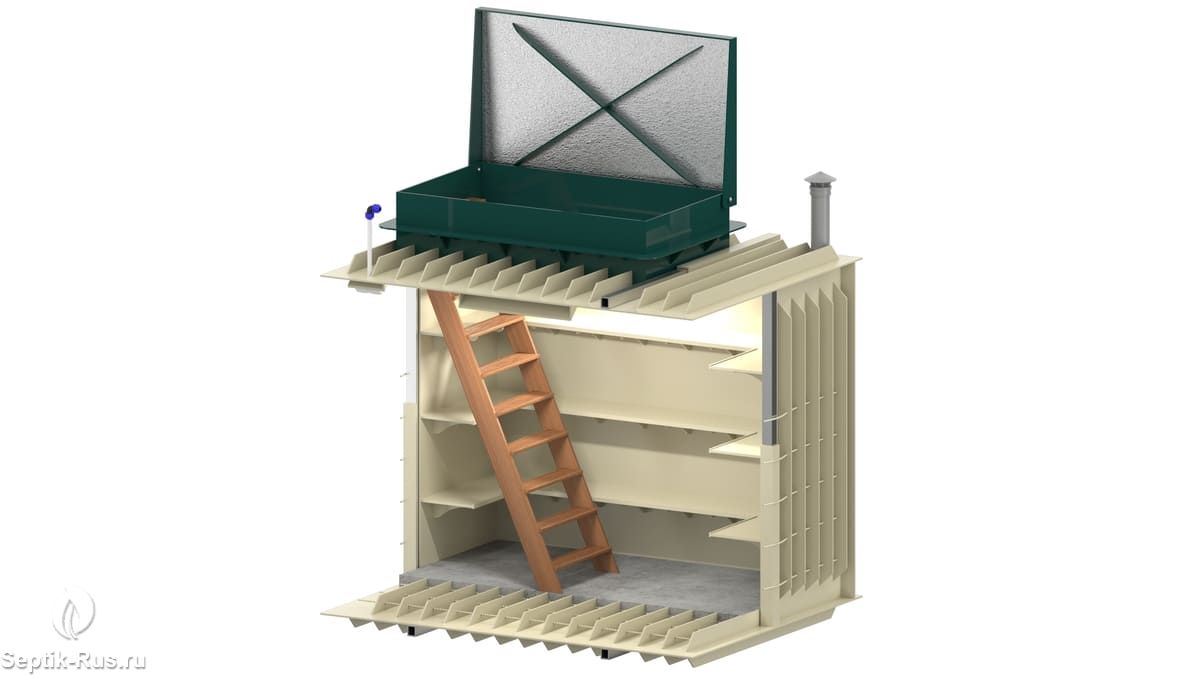 Конструкция устройства представляет собой заглубленное герметичное техническое помещение габаритами 2.5*2*2 м, оснащенное системой вытяжной и проточной вентиляции, установленным освещением.