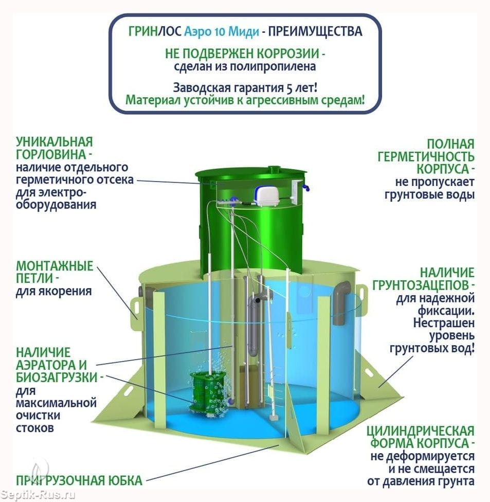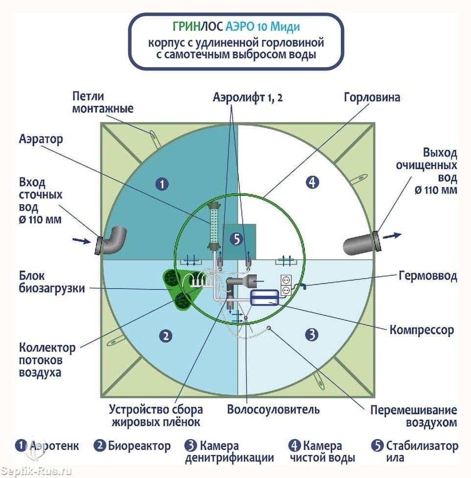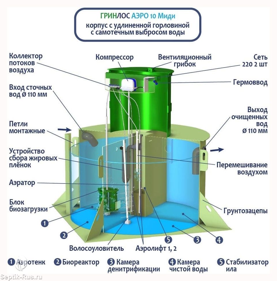 Аэратор способствует циркуляции воздуха и создает условия для размножения бактерий. Вместе с биозагрузкой достигается максимальный уровень переработки стоков.