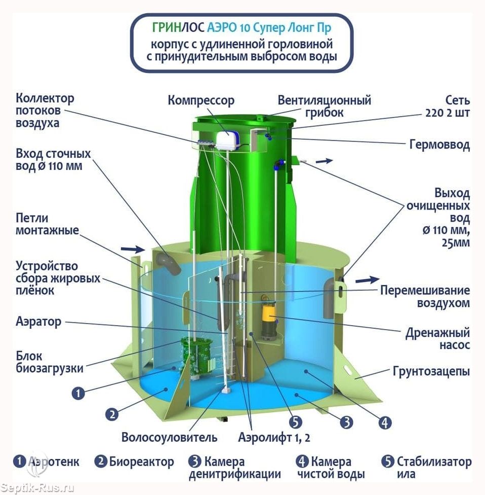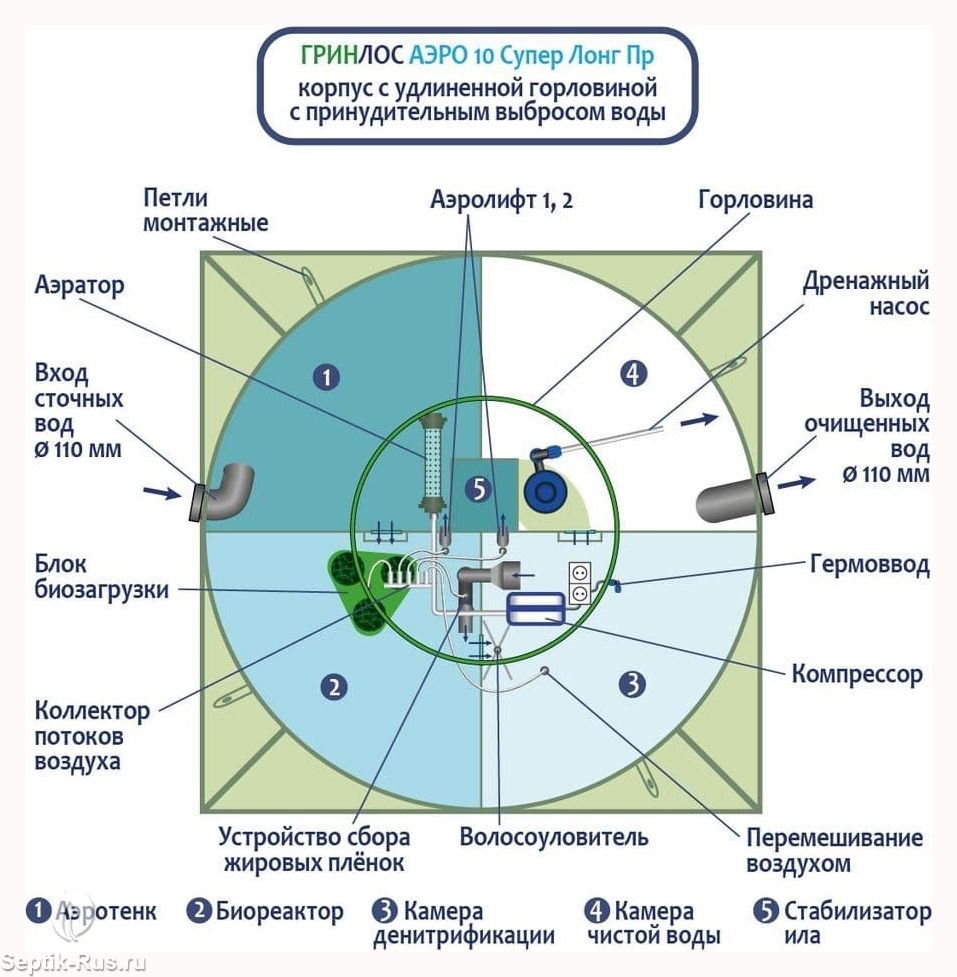 Аэратор способствует циркуляции воздуха и создает условия для размножения бактерий. Вместе с биозагрузкой достигается максимальный уровень переработки стоков.