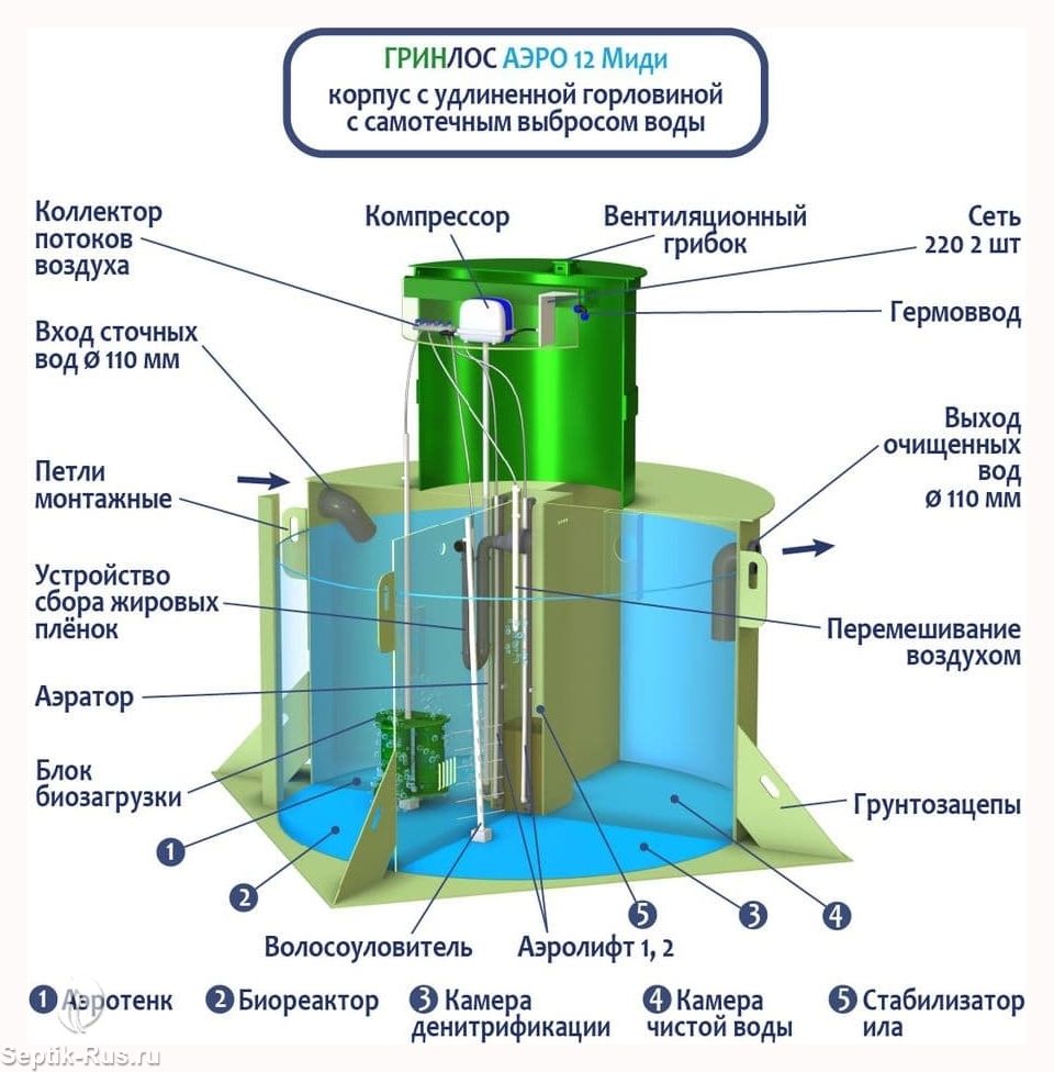 Аэратор способствует циркуляции воздуха и создает условия для размножения бактерий. Вместе с биозагрузкой достигается максимальный уровень переработки стоков.