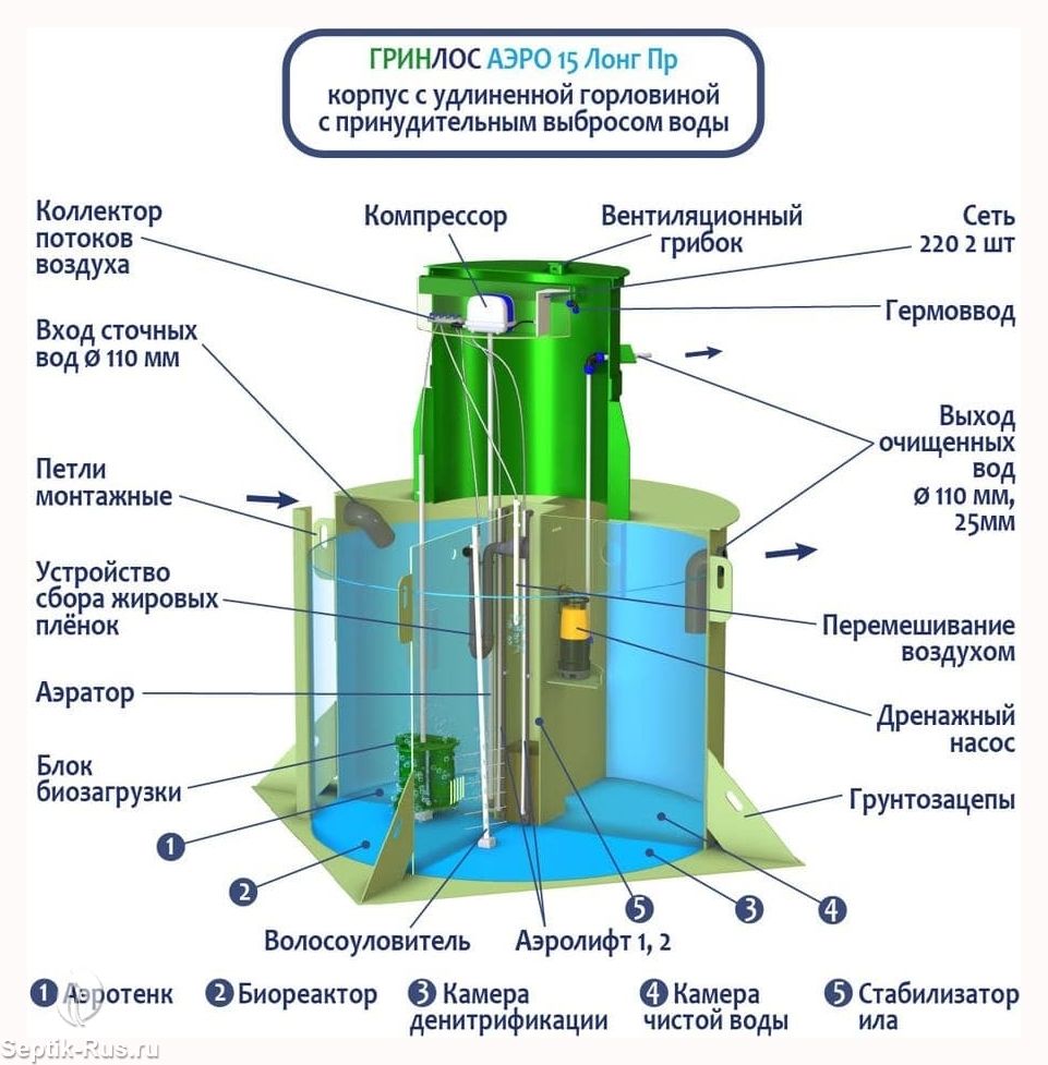 Аэратор способствует циркуляции воздуха и создает условия для размножения бактерий. Вместе с биозагрузкой достигается максимальный уровень переработки стоков.