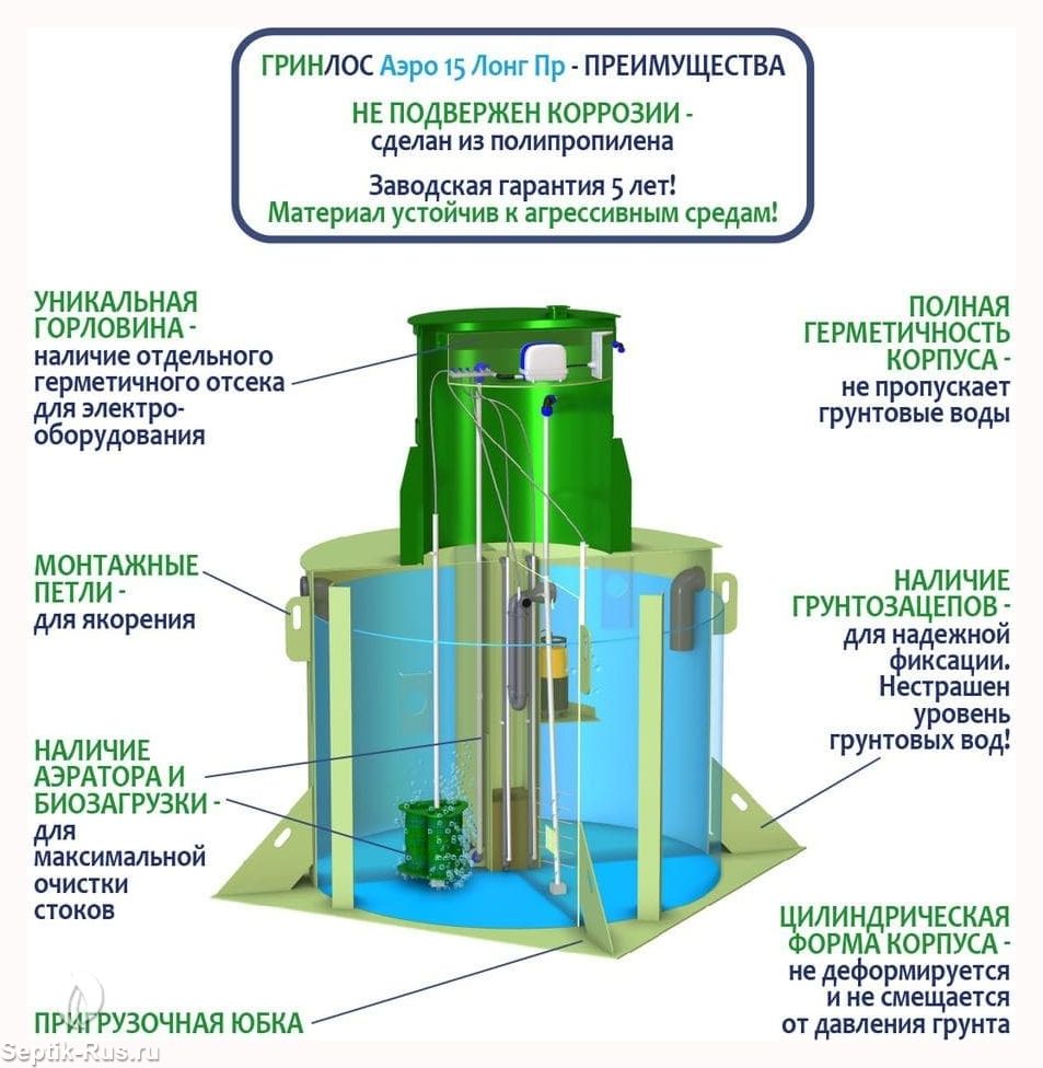 Биозагрузка, с помощью которой стоки очищаются более тщательно, входит в базовую комплектацию септика ГРИНЛОС Аэро 15 Пр Лонг.