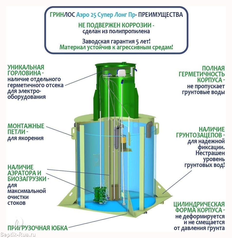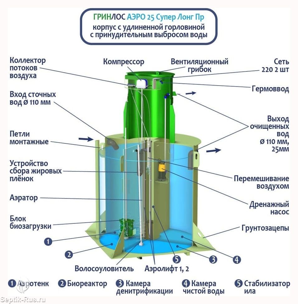 Аэратор способствует циркуляции воздуха и создает условия для размножения бактерий. Вместе с биозагрузкой достигается максимальный уровень переработки стоков.