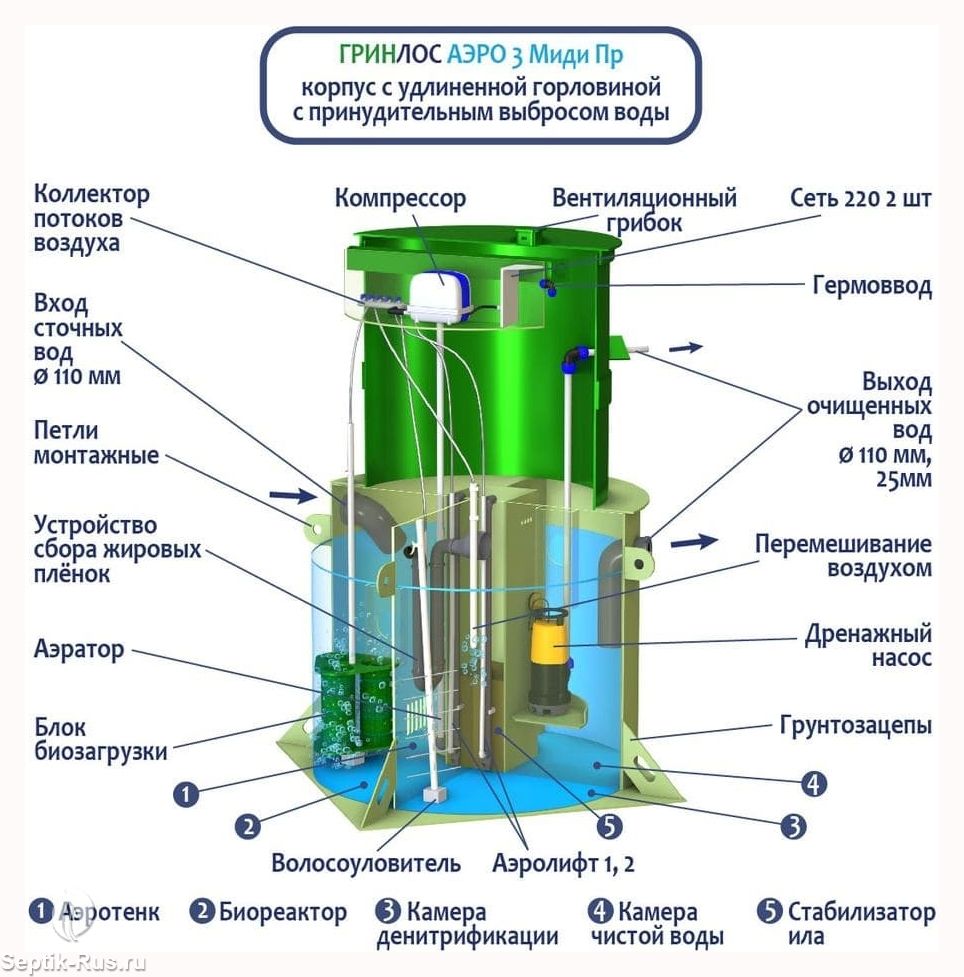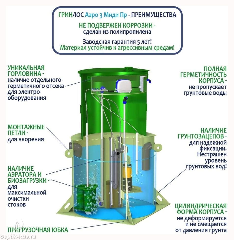 Биозагрузка, с помощью которой стоки очищаются более тщательно, входит в базовую комплектацию септика ГРИНЛОС Аэро 3 Пр Миди .