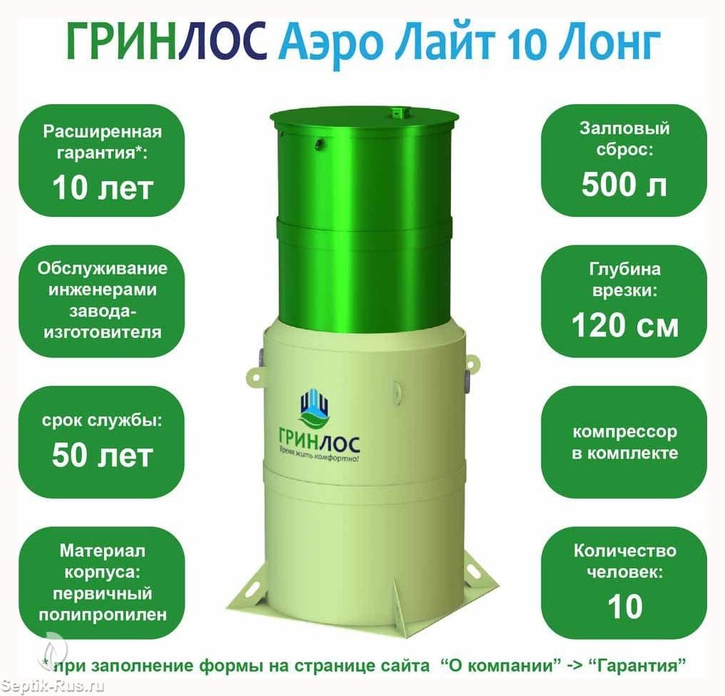Модификация Гринлос Аэро Лайт 10 Лонг выступает менее затратной в изготовлении и эксплуатации относительно септика Аэро .