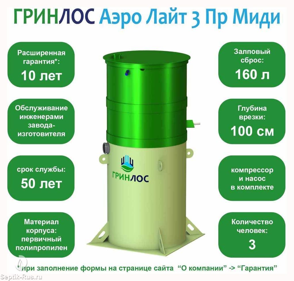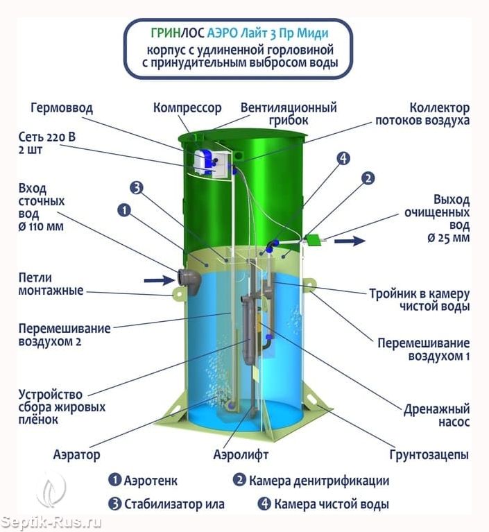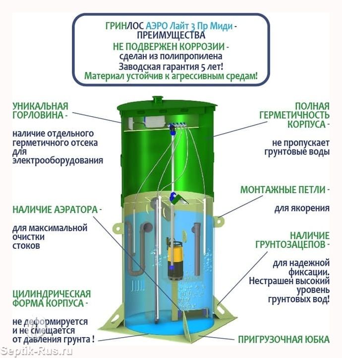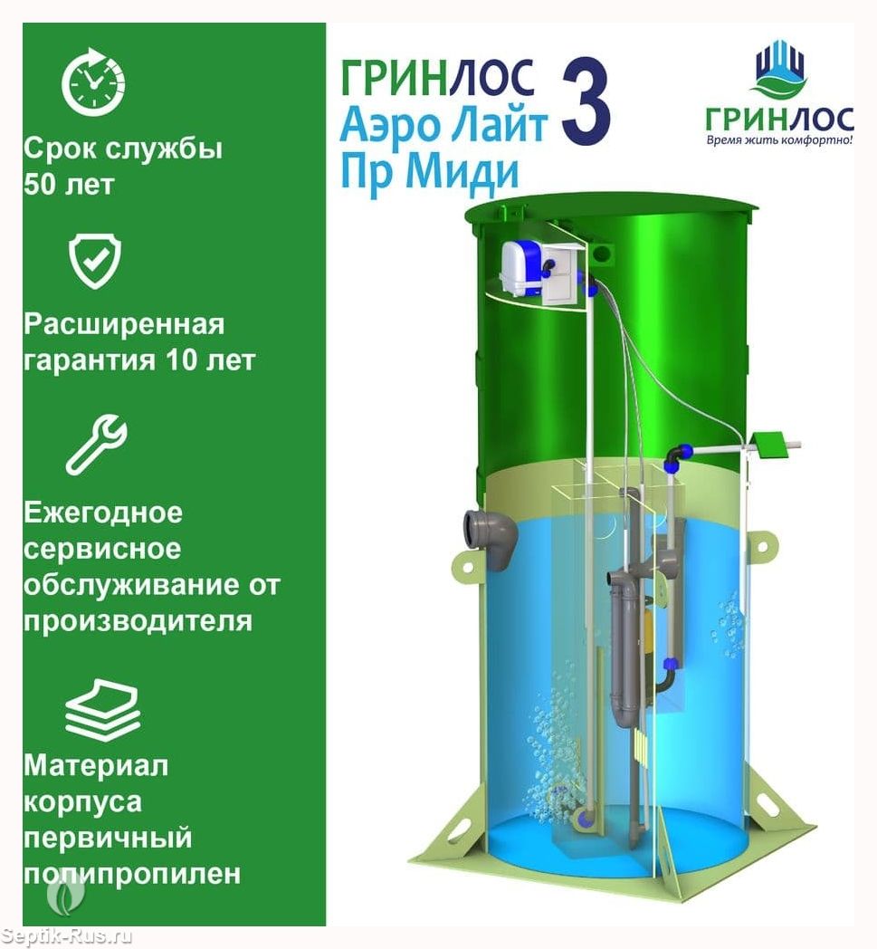 Станция Биологической Очистки Гринлос Аэро Лайт 3 Пр Миди предназначены для расщепления и переработки основных органических загрязнений, содержащихся в бытовых сточных водах. Эти процессы происходят в результате жизнедеятельности аэробных микроорганизмов, условия для жизнедеятельности которых создает септик.