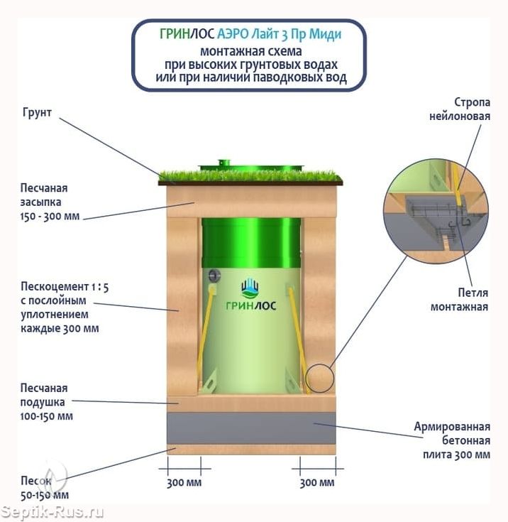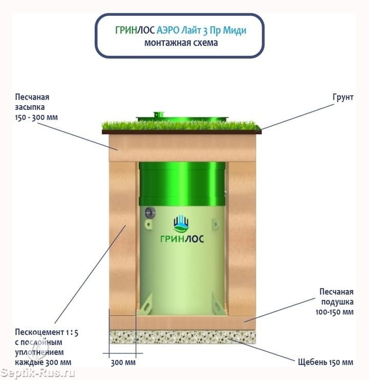 По боковым стенкам корпуса должно быть сохранено свободное расстояние до грунта не менее 250 мм. Дно котлована нуждается в более тщательной подготовке. Его подвергают выравниванию с последующей засыпкой слоем песка, обладающим толщиной в пределах 10-15 см. Пазухи котлована подвергают обратной засыпке при помощи песка, который послойно поливают водой. Прежде чем приступить к аналогичным работам, камеры септика Гринлос Аэро Лайт 3 Пр Миди на четверть заполняют водой. Впоследствии количество воды внутри емкости увеличивают соразмерно уровню засыпки песком наружных стенок. Каждые 200 мм песка подвергаются ручному уплотнению.