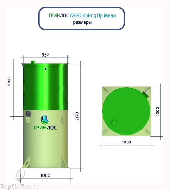 Септик Гринлос Аэро Лайт 3 Пр Миди изготавливается из первичного полипропилена. Корпус разделен на четыре отсека со специальными технологическими переливами. Перетекая из одной камеры в другую, стоки последовательно проходят процессы усреднения, аэрации, отстаивания, нитрификации и денитрификации, осветления, после чего выводятся в грунт принудительным или самотечным способом.