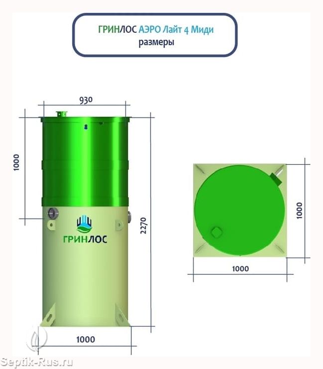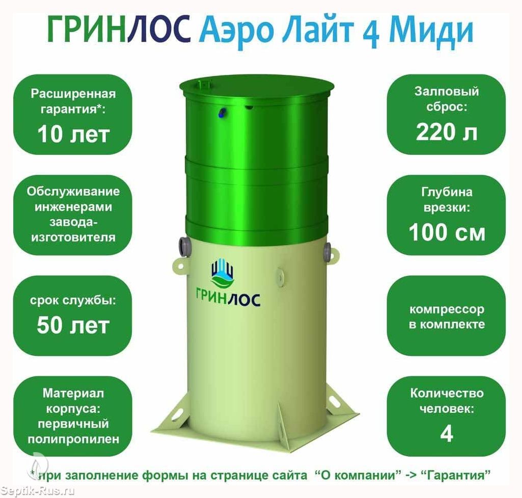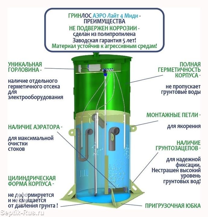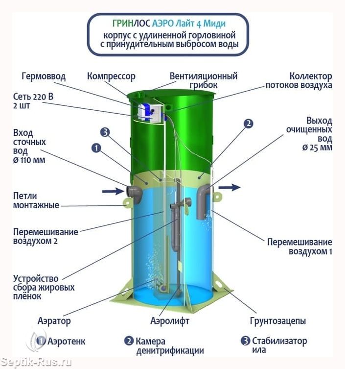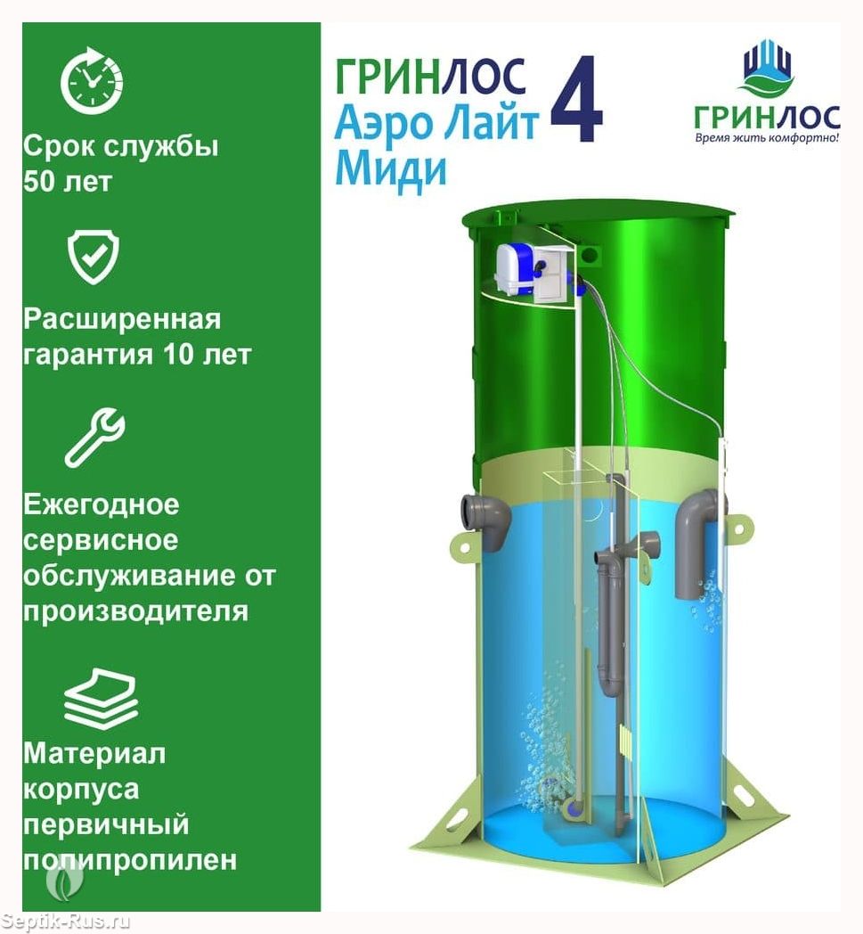 Станция Биологической Очистки Гринлос Аэро Лайт 4 Миди предназначены для расщепления и переработки основных органических загрязнений, содержащихся в бытовых сточных водах. Эти процессы происходят в результате жизнедеятельности аэробных микроорганизмов, условия для жизнедеятельности которых создает септик.