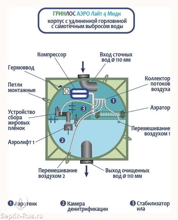 Септик Гринлос Аэро Лайт 4 Миди изготавливается из первичного полипропилена. Корпус разделен на четыре отсека со специальными технологическими переливами. Перетекая из одной камеры в другую, стоки последовательно проходят процессы усреднения, аэрации, отстаивания, нитрификации и денитрификации, осветления, после чего выводятся в грунт принудительным или самотечным способом.