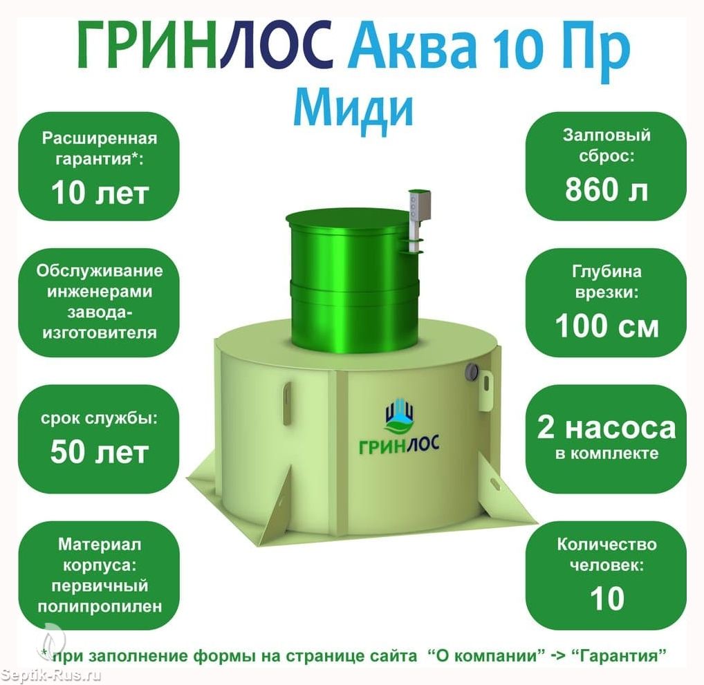 Модификация ГРИНЛОС Аква 10 Пр Миди – станция очистки с принудительным водоотведением и увеличенной высотой горловины, что позволяет подводить канализационную трубу на глубине до 100 см. Максимальный объем залпового сброса, на который рассчитан септик, составляет 580 л. Производительность станции составляет 2,8 м3/сут и рассчитана на переработку стоков, поступающих от 10 человек.