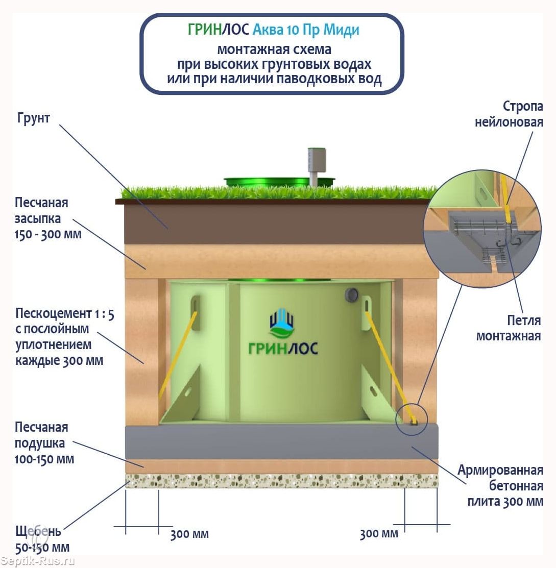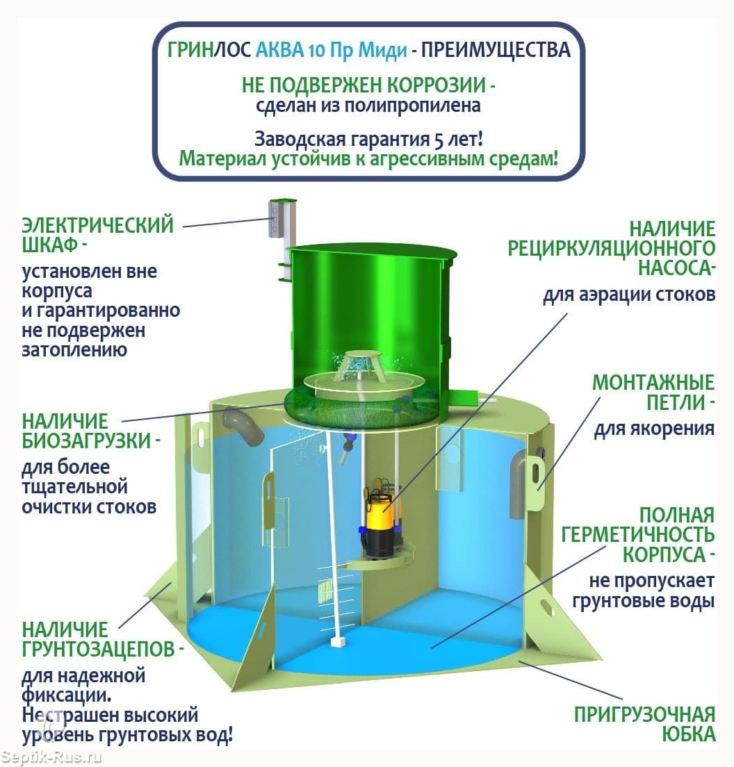 В базовую комплектацию ГРИНЛОС Аква 10 Пр Миди входит фильтр грубой очистки, с помощью которого мусор, попадающий со стоками, не просачивается в очищенную воду.