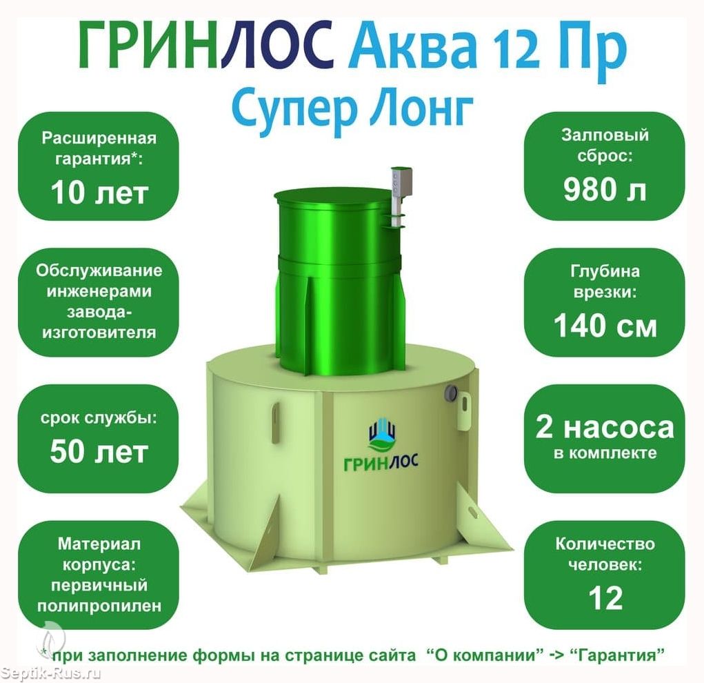 Модификация ГРИНЛОС Аква 12 Пр Супер Лонг – станция очистки с принудительным водоотведением и увеличенной высотой горловины, что позволяет подводить канализационную трубу на глубине до 140 см. Максимальный объем залпового сброса, на который рассчитан септик, составляет 730 л. Производительность станции составляет 3,5 м3/сут и рассчитана на переработку стоков, поступающих от 12 человек.