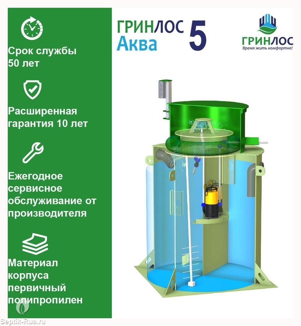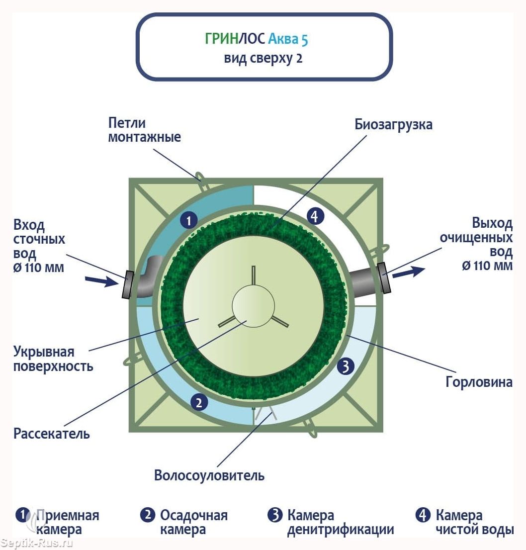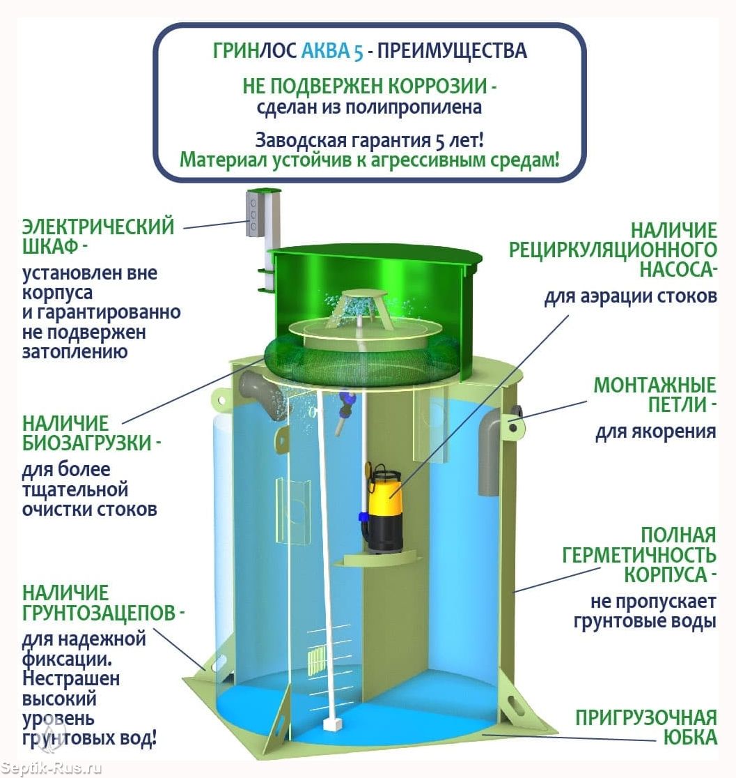 ГРИНЛОС Аква 5 изготавливаются из полипропилена чешского производства. Нижний уровень разделен на четыре отсека со специальными технологическими переливами. Перетекая из одного отстойника в другой, стоки проходят первоначальный процесс отстаивания, усреднения стоков, отделения нерастворимых фракций (жиров и т.д.), которые остаются в первом отсеке. При этом уже в первом отсеке начинается очистка стоков свободным активным илом. Затем, из третьего отсека, стоки посредством дренажного насоса подаются на верхний уровень, на специальный разбрызгиватель, через который происходит орошение биофильтра.