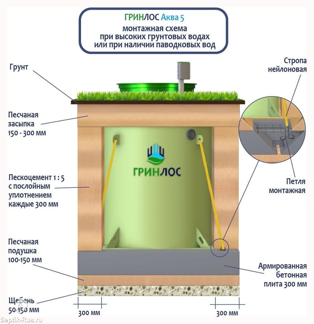 Перед непосредственным монтажом ГРИНЛОС Аква 5 специалисты осуществляют подготовку котлована. Его размеры определяются конструктивными особенностями выбранной модели оборудования.