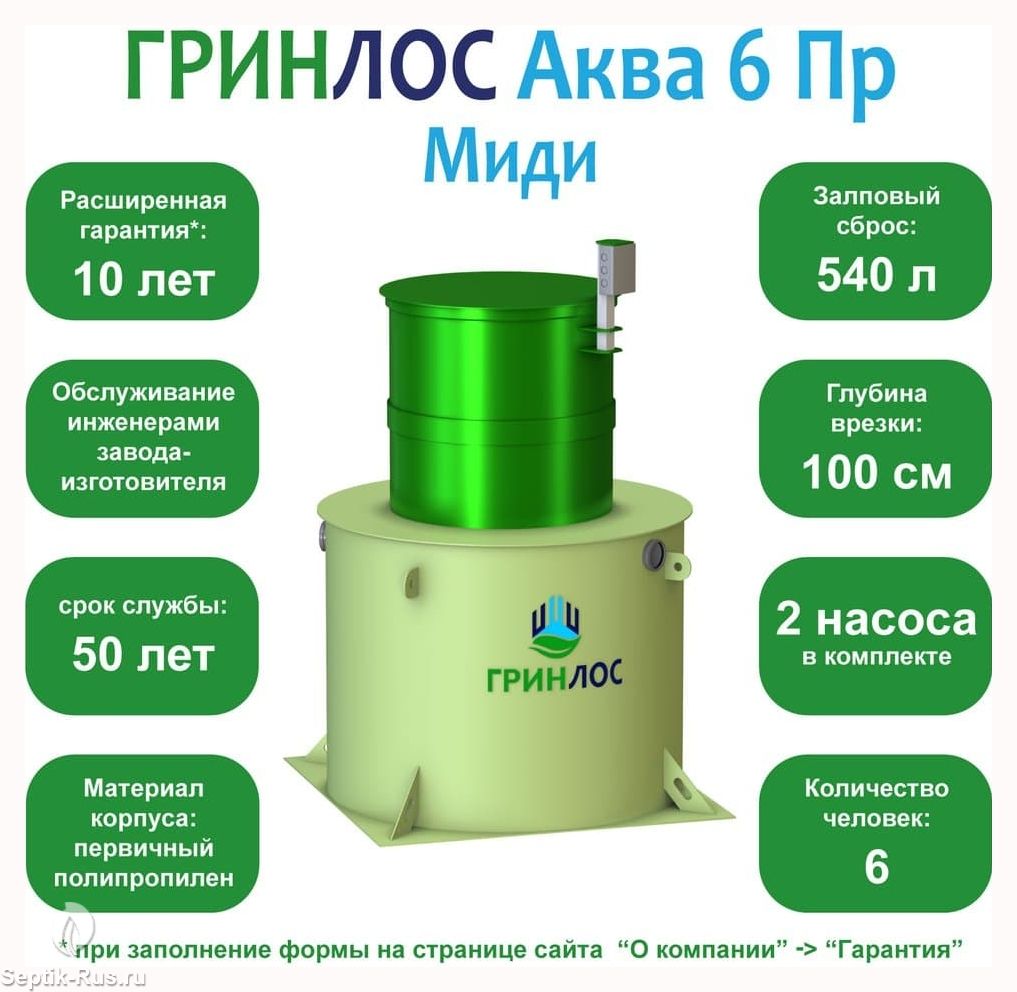 Модификация ГРИНЛОС Аква 6 Пр Миди – станция очистки с принудительным водоотведением и увеличенной высотой горловины, что позволяет подводить канализационную трубу на глубине до 100 см. Максимальный объем залпового сброса, на который рассчитан септик, составляет 390 л. Производительность станции составляет 1,68 м3/сут и рассчитана на переработку стоков, поступающих от 6 человек.