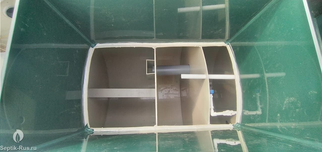 Переливы в септике ГРИНЛОС Профи 8 расположены таким образом, чтобы сточные воды протекали с наименьшей скоростью, благодаря чему в каждой камере происходит оседание грубодисперсных взвешенных частиц на дно.
