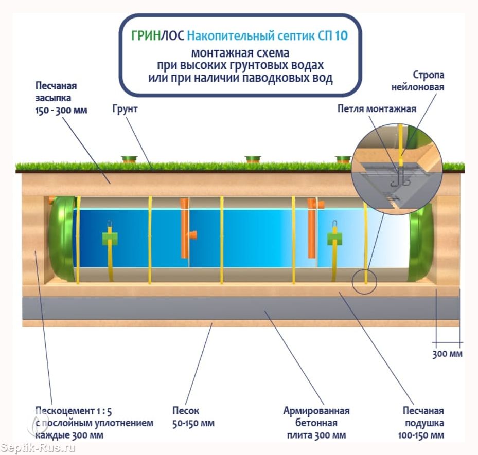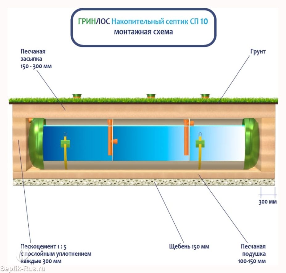 Поверх корпуса оборудования насыпается песчаный слой высотой 150-300 мм. Для подключения оборудования к внутренней канализационной системе используются предназначенные для этого канализационные трубы.