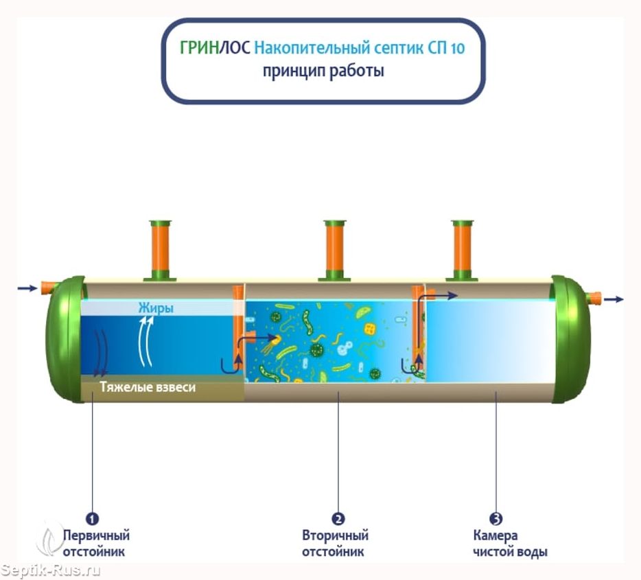 Септик обеспечивает поэтапную очистку сточных вод с разделением на фракции. Возможность использования биоферментных препаратов повышает эффективность и скорость очистки, что обеспечивает быструю обработку и отведение очищенных стоков.