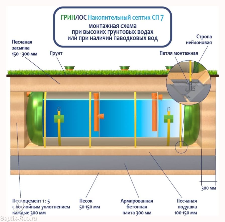 Поверх корпуса оборудования насыпается песчаный слой высотой 150-300 мм. Для подключения оборудования к внутренней канализационной системе используются предназначенные для этого канализационные трубы.
