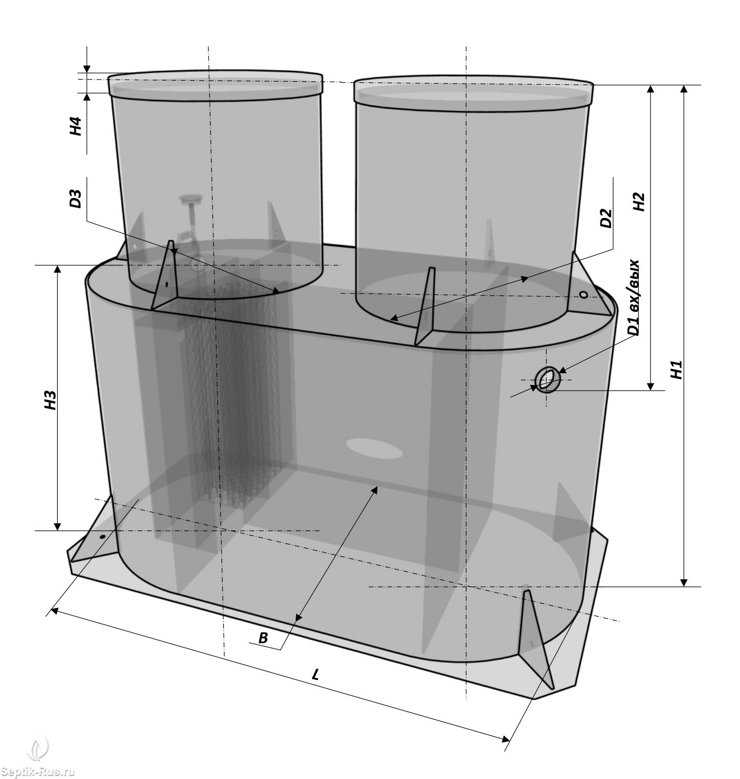 ОНИКС 10П изготовлен из полипропилена европейского производства. Материал характеризуется высокой прочностью и устойчивостью к коррозии. Корпус имеет вертикально вытянутую цилиндрическую форму. Данная модель имеет принудительное отведение очищенных вод.